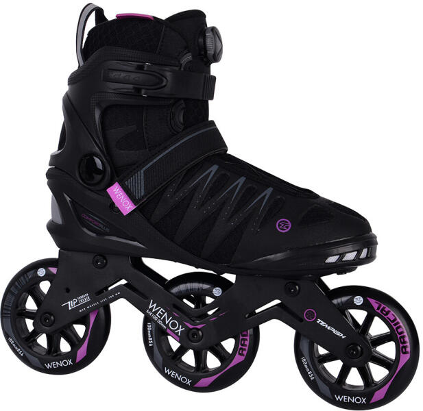 Női görkorcsolya - A kerekek mérete: 100 mm A kerekek keménysége: 85A Kerekek száma: 3 Csapágyak: ABEC 9 Szín: lila Fék: igen Rögzítő rendszer: fűző + tépőzár + csat Keret anyaga: alumínium