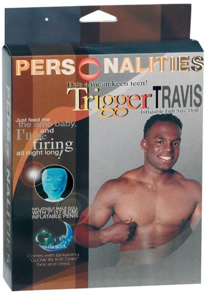 Trigger Travis felfújható szexbaba a hölgyek kívánságára. Életnagyságú méretével akár egy néger fiú, szórakoztat az ágyban. A jóképű férfi keményen játszik, pénisze 18 cm hosszú. A fekete modellt az Intim Center szexüzletéből beszerezhető. Akár leánybúcsú alkalmából is ideális az ünnepeltnek! A 3D-s arca világít a sötétben.
