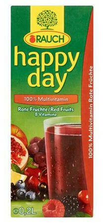 Megnevezés: Rauch Happy Day 100% Multivitamin vegyes gyümölcslé 8 vitaminnal 0,2 l Összetevők: Vegyes gyümölcslevek vegyes gyümölcslésűrítményekből (alma, szőlő, feketeribizli, meggy, citrom, málna, fekete szeder, bodza bogyó, kék áfonya, gránátalma, vörös áfonya), Vitaminok (tiamin, riboflavin, B6, C, E, biotin, kalcium-D-pantotenát, niacin)