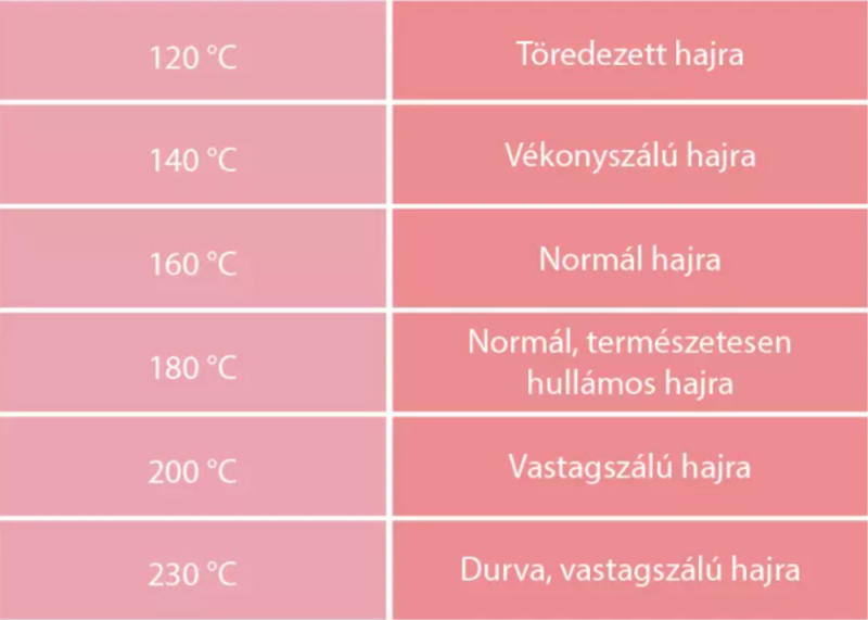 • 4. lépés: Állítsd be a kívánt hőmérsékletet, melyhez használd a + és – gombokat. A maximum hőmérséklet 230 Celsius fok. Válaszd ki a hajtípusodnak a megfelelő hőfokot.