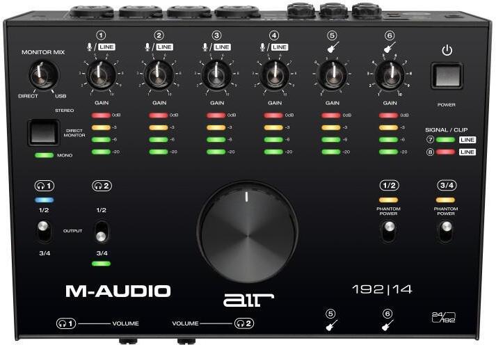 M-Audio AIR 192│14 Teljesíts bármilyen felvételi folyamatot professzionális minőségben! Az AIR 192│14 interface használatával könnyedén készíthetsz 24-bit/192kHz felbontású, stúdió minőségű felvételeket, melyben az intuitív kezelőfelület is segítségedre lesz. Az AIR 192│14 egyidejűleg nyolc független csatorna rögzítésére képes, négy dedikált XLR+6,35mm szimmetrikus kombinált-, két 6,35mm vonal- és két 6,35mm hangszer bemenetén keresztül, amelyek speciális kialakítása valósághű reprodukciót biztosít gitár- vagy basszusgitár használata esetén. A MIDI ki- és bemenet szintetizátorok és más külső MIDI eszközök fogadására alkalmas. Mellékelt szoftverek, a stílusodnak megfelelően! Az AIR 192│14 teljes körű szoftvercsomaggal érkezik, amely mindent tartalmaz a kezdéshez. Két népszerű DAW szoftver belépő verzióját is tartalmazza a csomag – ezek a Pro Tools│First M-Audio Edition és az Ableton Live Lite. Ezen felül egy egész sor effekt plugin, virtuális hangszer és loop gyűjtemény gondoskodik a produkciód minden igényéről. Akár gitár hangzásodat színesítenéd, esetleg reverb vagy delay effektre van szükséged, a megoldást megtalálod az Eleven Lite és az AIR Creative FX Collection lehetőségei között. Az AIR virtuális hangszerek között dobgép, szintetizátor, perkussziós hangszerek, elektromos orgona és zongora modellek találhatóak meg, amik világszínvonalú hangzással látják el dalaid. Crystal előerősítők, bizonyított A/D konverterek és prémium komponensek A Crystal előerősítők transzparens, alacsony zajszintű egységek, amelyek kiváló minőségben adják vissza a csatlakoztatott mikrofonok jelét. Az AIR 192│14 minőségi A/D konvertereket tartalmaz, amelyek 24-bit felbontással rögzítenek, ezáltal kiterjedt dinamikatartományt biztosítanak, miközben az előadás legkisebb rezdülését is rögzítik. Hallgasd előadásod valós időben – ne késéssel A hangrögzítés során a legjobbat szeretnéd nyújtani – a monitorozás során nem zavarhatnak be zajok, valamint a jel késése sem megengedhető. Az AIR 192│14 egy nagysebességű USB kapcsolattal van felszerelve, emellett kategóriájában legalacsonyabb idejű késeltetést (2,59ms) biztosítja. A bemenetek közvetlen belehallgatásához monitor mix szabályzó áll rendelkezésre. Többszegmensű VU-meter a megfelelő jel beállításához Előad s rögzítésénél a leginkább megfelelő jelszint beállítására törekszünk. Az AIR 192│14 többszegmensű VU LED-ekkel (-20dB-től 0dB) felszerelt, ezzel segítséget nyújtva az optimális jelszint beállításához. Jellemzők: < ul>