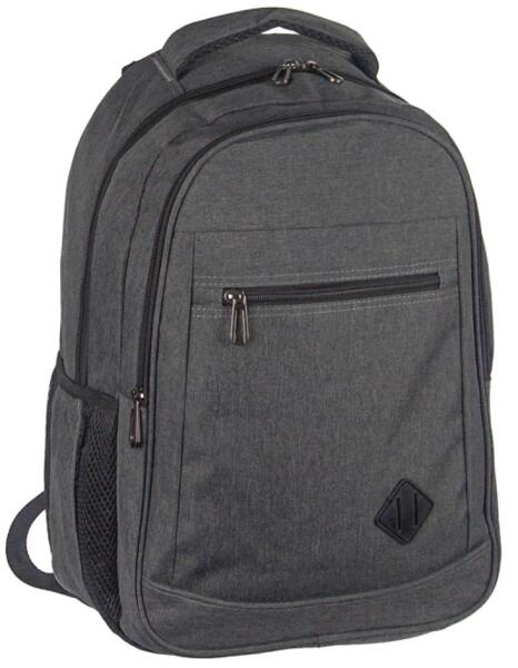 A szürke hátizsák három cipzárral zárható és két nyitott rekesszel rendelkezik. Hátoldala merevített A legnagyobb van leghátul. Ennek bősége alul 14 cm, felül 13 cm. Hátoldali bélése előtt van egy párnázott műselyem falú laptoptartó zseb. A fő rész előtt helyezkedik el egy 4 cm bőségű, 38 cm magasságú középső része. A hátizsák legelején van még egy 27 cm magas lapos zseb aminek cipzárja 22 cm magasan helyezkedik el és 15 cm hosszban nyílik. A hátizsák mindkét oldalán van egy-egy 18 cm magas saját és hálós anyagból kombinált anyagú, gumis szegéllyel ellátott felül nyitott, italtartó jellegű zseb. A hátizsák hátoldala elég keményen és vastagságon párnázott. 8 cm széles párnázott vállpántjainak hossza középen mérve 88 cm, belső oldaluk hálós anyaggal fedett. Tetején egy 3,5 cm széles, saját anyagából készült párnázott kézi fogó található, valamint van egy kicsi hevederből készült fogója amivel fel lehet akasztani.