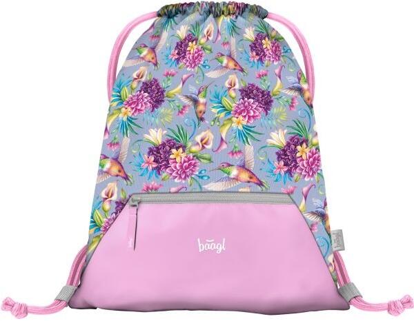 A lila színű tornazsákon virágok között kolibrik repkednek.