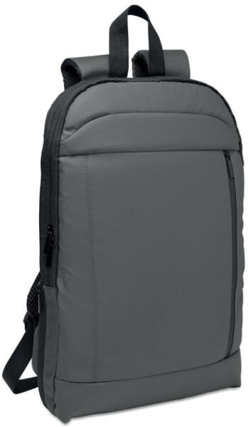 Bővíthető, 600D RPET poliészterből készült 16 colos laptop hátizsák PU bevonattal az elején, RPET poliészter béléssel. Rejtett cipzáras zseb és párnázott laptop rekesz, elülső rekesz, hálós hátoldal és gurulós bőröndre illeszkedő pánt.
