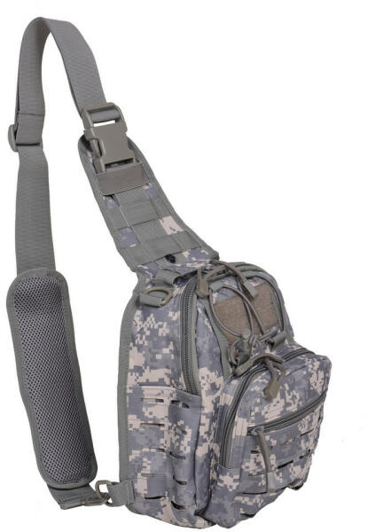 Többrekeszes bodypack, a vállpánttal ellentétes irányú rögzítőheveder miatt stabilan fekszik a háton nagyobb fizikai megterhelés alatt is. M. O. L. L. E rendszerű zsebekkel bővíthető