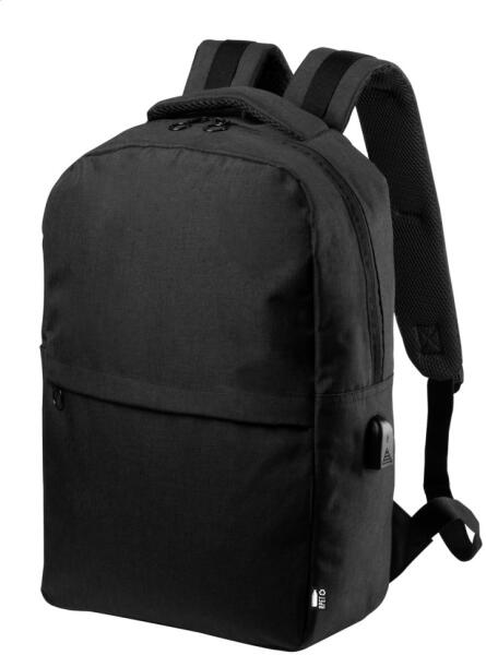 Hátitáska cipzáras rekeszekkel, párnázott laptop- (15") és tablettartó (10") rekesszel, párnázott hátrésszel és vállpántokkal. Megkülönböztető RPET címkével és beépített USB csatlakozóval power bankokhoz. 600D RPET poliészter.