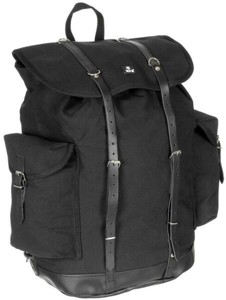 BW Mountain hátizsák, régi modell, feketeállítható vállpántok levehető párnázássalbőrszíjak fémcsatos csatokkal1 felső fogantyúfedél 4 fém D-gyűrűvel és 2 tűs csattalfő rekesz húzózsinórral éslapos becsúsztatható zsebbel pl. hálóalátét számára2 csatolt oldalzseb patenttal éstűs csattal és