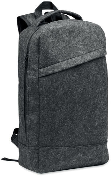13 colos laptop hátizsák RPET filcből, párnázott vállpánttal, fő belső rekesszel. Cipzáras belső rekesz. Hátoldalán gurulós bőröndre illeszkedő pánttal.