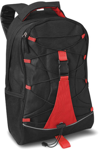 Fekete hátitáska színes betéttel és zsinórral az elején. 600D poliészter anyagból. Kétoldalt hálós zseb a palackoknak.