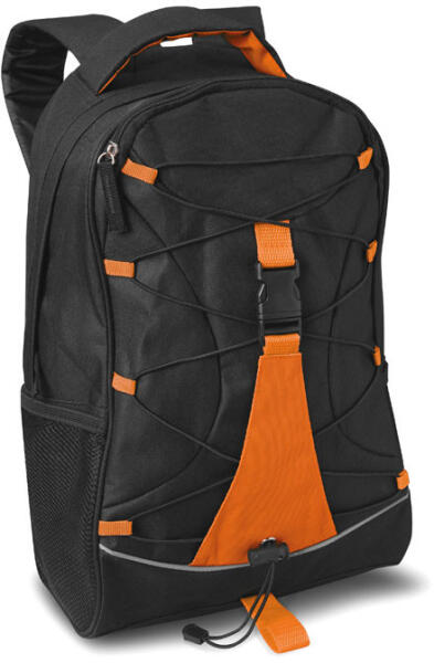 Fekete hátitáska színes betéttel és zsinórral az elején. 600D poliészter anyagból. Kétoldalt hálós zseb a palackoknak.