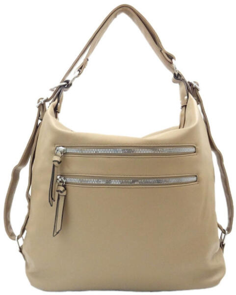 Bézs női táska, többfunkciós: válltáska, hátitáska, keresztpántos oldaltáska. Ez a szép, minőségi női táska bézs színben mindig jó választás, bármilyen szetthez. Sok zsebes, így mindennek megtalálható benne a legjobb hely. Elől két nagy cipzáras rekesz a táska külső részén, egy cipzáras zseb a táska hátoldalán, szintén a külső részen. A bézs táska belső része is nagyon praktikus. Két külön nyíló nagy tárolórész ad helyet a holmijainknak. Belül még egy cipzáras és két nyotott oldalzseb is található. Az állítható és variálható vállpántokkal kényelmesen, többféleképpen hordható.