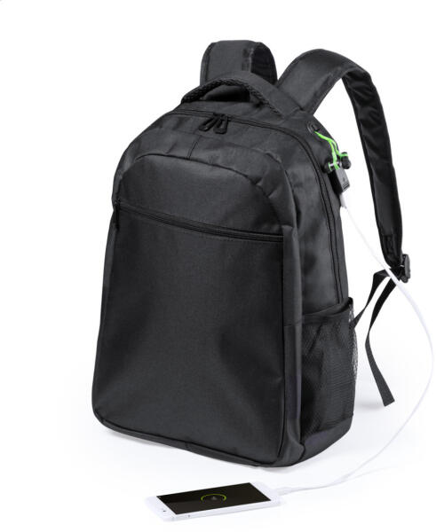 Vízálló hátizsák bélelt laptop (15") és tablettartó (10") résszel, fülhallgató kimenettel, beépített USB csatlakozóval power bankhoz (nem tartalmazza), hálós oldalzsebekkel és állítható vállpánttal. Anyaga: 600D poliészter.