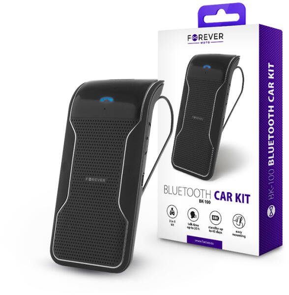 A Forever BK-100 Bluetooth kihangosító kényelmes és biztonságos használatot biztosít a hangszóró és mikrofon segítségével telefonálás közben amikor vezet. A multipoint funkció lehetővé teszi az egyidejű kapcsolatot a két telefon között korlátozás nélkül. Egyetlen 3 órás feltöltéssel akár 16 óra beszélgetési, vagy 40 nap készenléti időt biztosít.