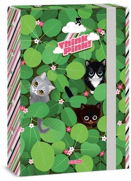 A Think Pink mintájú mappán cuki kis macskák játszanak virágok és zöld levelek között.