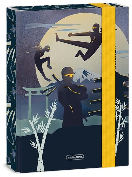 A vagány füzetbox mintáján nindzsák harcolnak az éjszakában. Az Ars Una kemény borítású füzetbox segítségével könnyedén tárolhatók a füzetek akár a táskában is. A füzettartó mappa segít rendezni a tanszereket és a gyűrődéstől is megóvja.