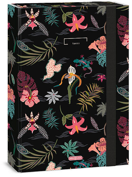 A mappán fekete alapon trópusi virágok vannak. Az Ars Una kemény borítású füzetbox segítségével könnyedén tárolhatók a füzetek, tankönyvek akár a táskában is. A füzetbox segít rendezni a tanszereket és a gyűrődéstől is megóvja.