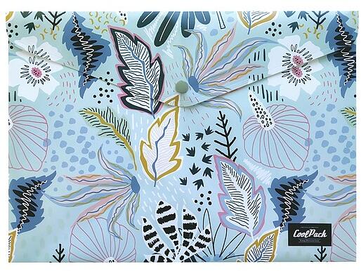 Praktikus A4-es irattartó tasak, mely ideális számlák, rajzok, művészeti munkák, iskolai jegyzetek vagy egyéb dokumentumok tárolására. Egyszerű patentos záródás. Kellemes, harmonikus megjelenés pasztell színű levelek és növények motívumaival. Ez a mintázat más CoolPack terméknél is megtalálható, komplett kollekció kialakítható. formátuma: A4, anyaga: PP, patentos záródás, nedves ruhával tisztítható