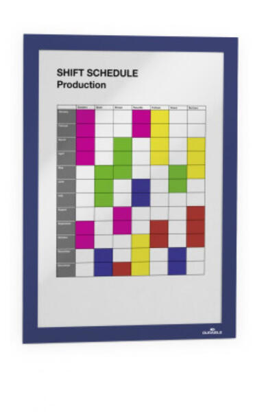 DURAFRAME® keret, öntapadó hátlappal és mágneses előlappal többféle méretben. A DURAFRAME® segítségével profin és kényelmesen helyezhetjük ki dokumentumainkat. Egyszerűen vegyük le a védőfóliát és ragasszuk fel az öntapadó keretet bármilyen sima, kemény felületre, például ablakra, iratszekrényre vagy ajtóra. A DURAFRAME® könnyedén áthelyezhető például üveg felületeken anélkül, hogy nyomot hagyna. Információ kihelyezés professzionális módja A kihelyezett dokumentumok egyszerű cseréje a mágneses záródásnak köszönhetően Könnyen kihelyezhető bármilyen sima felületre Felhasználási területek: hirdetések, információ kihelyezés, tájékoztatás, irányítás Üvegen használva a keret mindkét oldalon látható, így két irányban is lehet kommunikálni, elegáns formában Álló és fekvő formátumban is használható Külső méret: 236 x 323 mm Katalóguskód: 24788