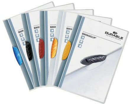 A/4-es méretű DURABLE Swingclip klipes mappa, áttetsző fedőlappal és különböző, élénk színű klippel.
