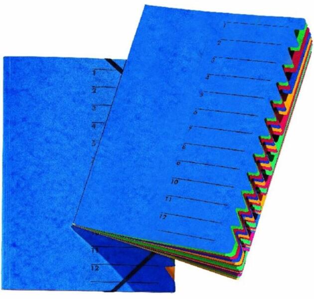 12 részes rendszerező mappa újrahasznosítható anyagból. A praktikus, színes fülek ideálisak a fontos dokumentumok egyértelmű szortírozásához és tárolásához. A mappa különösen rugalmasan használható a borítón található számnyomtatásnak és az egyedi címkézés lehetőségének köszönhetően. A fekete sarokgumi biztonságosan a helyén tartja a lapokat - így azok biztonságosan szállíthatók is.