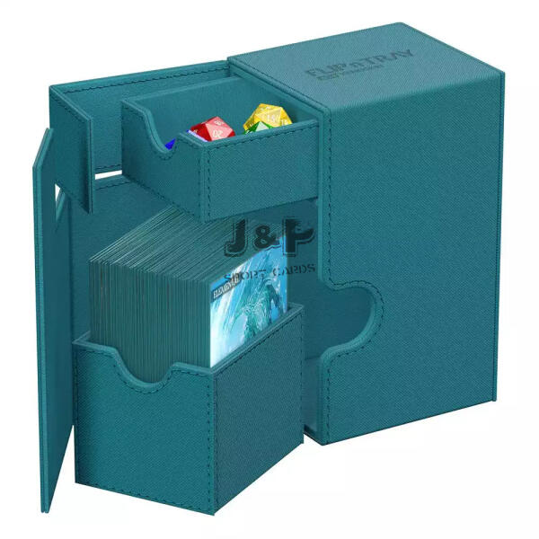 Az alapvető Ultimate Guard deck case: időtlen kialakítás erős mágneses zárással, kártya- és kockatartókkal a pakli biztonságos tárolására, valamint ellenálló, de sima Xenoskin felülettel. A 80 db dupla sleeveben vagy 100 db szimplán bugyizott kártya tárolására alkalmas normál méretben. *a kártyákat és dobókockákat nem tartalmazza! Gyártó termék oldala: Ultimate Guard Flip'n'Tray Deck Case 80+ Standard Size XenoSkin Petrol Blue