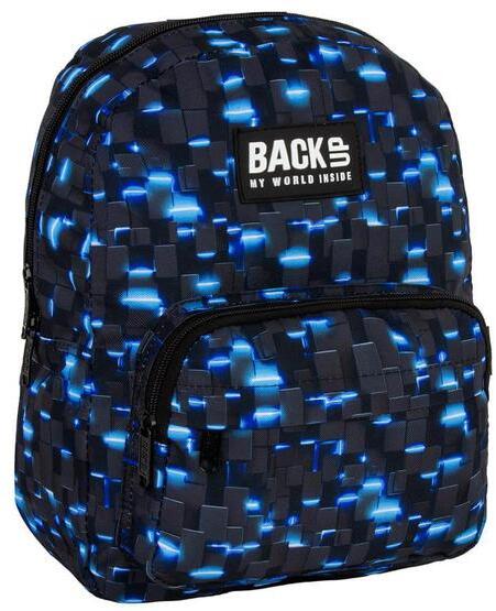 A BackUp hátizsák - 1 rekeszes - Black, blue (PLB7F44)  letisztult fekete, kék színű táska a nagyobb korosztály ruhatárának kiegészítője. A hátizsák egy nagy rekesszel, egy kisebb méretű, cipzáras zsebbel és két kis hálós oldalzsebbel rendelkezik. A légáteresztő hálóval borított, szivacsos vállpánt állítható,  a rajta lévő mellkaspánt tal pedig még kényelmesebbé teszi viselését. A hátizsák anyaga vízálló, a   tetején lévő megerősített fogantyúval kézben is vihető. A BackUp hátizsák  remek választás kiránduláshoz és könnyebb iskolai napokra is.