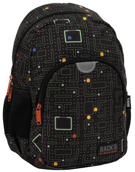 A BackUp hátizsák mellpánttal - 1 rekeszes - PacMan (PLB5T102)  az egyik legismertebb videojáték ihlette mintákkal dekorálva a nagyobb korosztály ruhatárának kiegészítője. A hátizsák egy nagy rekesszel, egy kisebb méretű, cipzáras zsebbel és két kis hálós oldalzsebbel rendelkezik. A légáteresztő hálóval borított, szivacsos vállpánt állítható,  a rajta lévő mellkaspánt tal pedig még kényelmesebbé teszi viselését. A hátizsák anyaga vízálló, a   tetején lévő megerősített fogantyúval kézben is vihető. A BackUp hátizsák  remek választás kiránduláshoz és könnyebb iskolai napokra is.