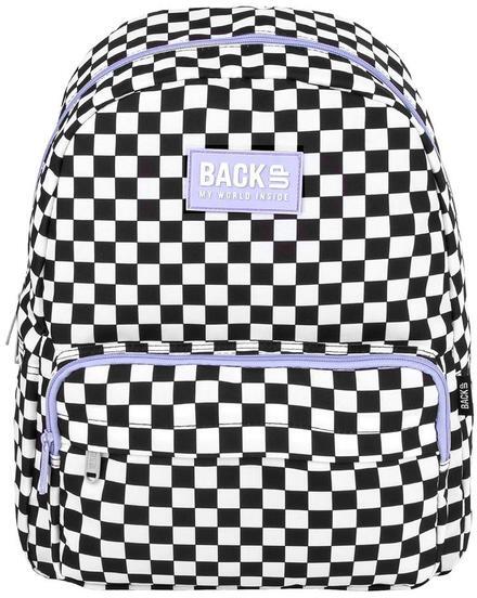 A BackUp iskolatáska, hátizsák - 1 rekeszes - Pepita, lila (PLB7C94F)  letisztult lila fehér táska a nagyobb korosztály ruhatárának kiegészítője. A hátizsák egy nagy rekesszel, egy kisebb méretű, cipzáras zsebbel és két kis hálós oldalzsebbel rendelkezik. A légáteresztő hálóval borított, szivacsos vállpánt állítható,  a rajta lévő mellkaspánt tal pedig még kényelmesebbé teszi viselését. A hátizsák anyaga vízálló, a   tetején lévő megerősített fogantyúval kézben is vihető. A BackUp hátizsák  remek választás kiránduláshoz és könnyebb iskolai napokra is.
