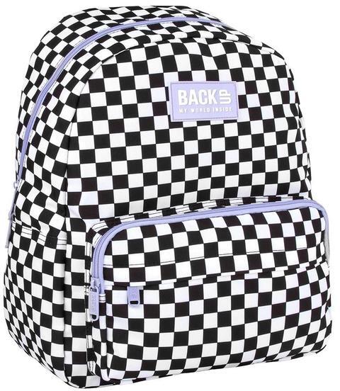 A BackUp iskolatáska, hátizsák - 1 rekeszes - Pepita (PLB7C94)  letisztult fekete fehér táska a nagyobb korosztály ruhatárának kiegészítője. A hátizsák egy nagy rekesszel, egy kisebb méretű, cipzáras zsebbel és két kis hálós oldalzsebbel rendelkezik. A légáteresztő hálóval borított, szivacsos vállpánt állítható,  a rajta lévő mellkaspánt tal pedig még kényelmesebbé teszi viselését. A hátizsák anyaga vízálló, a   tetején lévő megerősített fogantyúval kézben is vihető. A BackUp hátizsák  remek választás kiránduláshoz és könnyebb iskolai napokra is.