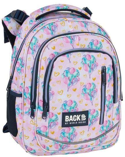BackUp Ballons hátizsák a gyerekek  ruhájának divatos kiegészítője. A hátizsák 3 különböző méretű cipzáras rekesszel, elöl plusz 1 kisebb cipzáras zsebbel és 2 hálós oldalzseb bel rendelkezik. Hátoldala merevített, ergonomikus kialakítású, légáteresztő hálós szivaccsal. Állítható vállpánt ja szivacsos, légáteresztő hálós fedőréteggel, diszkrét fényvisszaverők kel ellátott. A belső rekeszekben több kisebb rendszerező zseb található, amikben elfér például a mobil telefon és töltő, fülhallgató, pendrive, kulcs. A tetején lévő megerősített fogantyúval kézben is vihető, a másik fogantyúval felakasztható. A megerősített anyagnak köszönhetően az alsó része erős, strapabíró . A szabvány A/4-es méretű tankkönyv elfér benne, az A/4-es méretű gumis mappa viszont nem. A  BackUp hátizsák  tökéletes választás a könnyebb iskolai napokra vagy kirándulásokra!