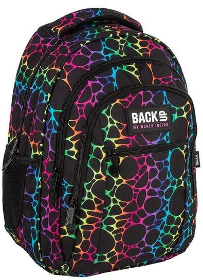 BackUp Szivárvány hátizsák a gyerekek  ruhájának divatos kiegészítője. A hátizsák 3 különböző méretű cipzáras rekesszel, elöl plusz 1 kisebb cipzáras zsebbel és 2 hálós oldalzseb bel rendelkezik. Hátoldala merevített, ergonomikus kialakítású, légáteresztő hálós szivaccsal. Állítható vállpánt ja szivacsos, légáteresztő hálós fedőréteggel, diszkrét fényvisszaverők kel ellátott. A belső rekeszekben több kisebb rendszerező zseb található, amikben elfér például a mobil telefon és töltő, fülhallgató, pendrive, kulcs. A tetején lévő megerősített fogantyúval kézben is vihető, a másik fogantyúval felakasztható. A megerősített anyagnak köszönhetően az alsó része erős, strapabíró . A szabvány A/4-es méretű tankkönyv elfér benne, az A/4-es méretű gumis mappa viszont nem. A  BackUp hátizsák  tökéletes választás a könnyebb iskolai napokra vagy kirándulásokra!