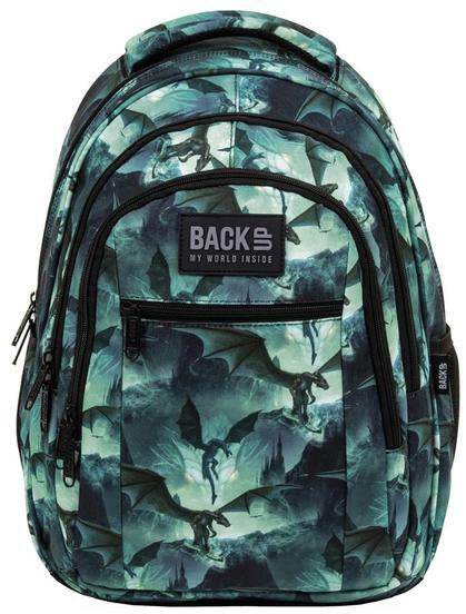 BackUp iskolatáska, hátizsák mellpánttal - 3 rekeszes - Dragons egyedi, fekete-zöld mintával az iskolás korosztály ruhatárának divatos kiegészítője. A hátizsák 3 különböző méretű cipzáras rekeszében elférnek a könyvek, füzetek, elején pedig kis cipzáras zseb található. Kétoldalt egy-egy hálós zseb található az innivaló, esernyő tárolására. Hátoldala merevített, ergonomikus kialakítású, légáteresztő hálós szivaccsal. Állítható vállpántja szivacsos, légáteresztő hálós fedőréteggel, diszkrét fényvisszaverőkkel ellátott. A mellkaspánt leveszi a gyermek válláról a terhelést, ezáltal még kényelmesebbé téve a hátizsák viselését.  A belső zsebekben több kisebb rendszerező zseb , kulcstartó és  tablet tartó zseb is van.  A tetején lévő megerősített fogantyúval kézben is vihető, a másik fogantyúval felakasztható a fogasra. A megerősített anyagnak köszönhetően az alsó része erős, strapabíró .  A BackUp Prime hátizsák  fiatalos és trendi, ezzel a hátizsákkal igazán menő lehetsz a suliban!