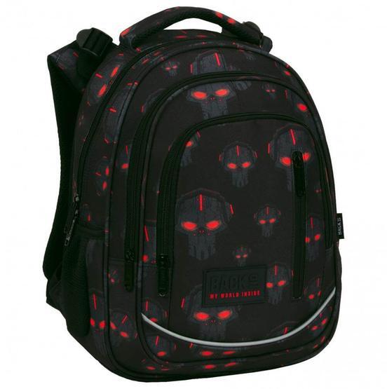 BackUp hátizsák a kisfiúk ruhájának divatos kiegészítője. A hátizsák 3 különböző méretű cipzáras rekesszel, elöl plusz 1 kisebb cipzáras zsebbel és 2 hálós oldalzseb bel rendelkezik. Hátoldala merevített, ergonomikus kialakítású, légáteresztő hálós szivaccsal. Állítható vállpánt ja szivacsos, légáteresztő hálós fedőréteggel, diszkrét fényvisszaverők kel ellátott. A belső rekeszekben több kisebb rendszerező zseb található, amikben elfér például a mobil telefon és töltő, fülhallgató, pendrive, kulcs. A tetején lévő megerősített fogantyúval kézben is vihető, a másik fogantyúval felakasztható. A megerősített anyagnak köszönhetően az alsó része erős, strapabíró . A szabvány A/4-es méretű tankkönyv elfér benne, az A/4-es méretű gumis mappa viszont nem. A fekete és piros  BackUp Robotos hátizsák  különleges robot maszkokat ábrázol  , ami tökéletes választás a könnyebb iskolai napokra vagy kirándulásokra!