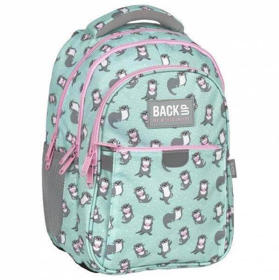 BackUp hátizsák a kislányok ruhájának divatos kiegészítője. A hátizsák 3 különböző méretű cipzáras rekesszel, elöl plusz 1 kisebb cipzáras zsebbel és 2 hálós oldalzseb bel rendelkezik. Hátoldala merevített, ergonomikus kialakítású, légáteresztő hálós szivaccsal. Állítható vállpánt ja szivacsos, légáteresztő hálós fedőréteggel, diszkrét fényvisszaverők kel ellátott. A belső rekeszekben több kisebb rendszerező zseb található, amikben elfér például a mobil telefon és töltő, fülhallgató, pendrive, kulcs. A tetején lévő megerősített fogantyúval kézben is vihető, a másik fogantyúval felakasztható. A megerősített anyagnak köszönhetően az alsó része erős, strapabíró . A szabvány A/4-es méretű tankkönyv elfér benne, az A/4-es méretű gumis mappa viszont nem. A fekete és fehér  BackUp Vidrás hátizsák  különleges cuki vidrákat ábrázol  , ami tökéletes választás a könnyebb iskolai napokra vagy kirándulásokra!