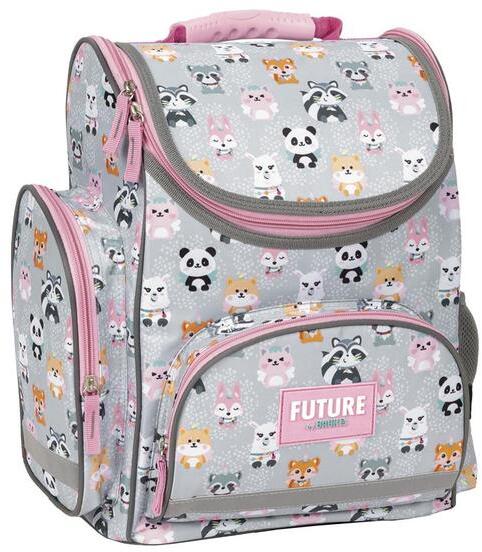 A Future by BackUp ergonomikus iskolatáska - Cute animals  divatos színvilágának és cuki mintáinak köszönhetően gyorsan rabul ejti majd a kislányok szívét. Az ergonomikus megnevezés azt takarja, hogy a tervezés során figyelembe veszik a kisiskolás korú gyermekek testi adottságait és olyan hátizsákot készítenek, mely kíméli a gerincet, segíti a helyes testtartást. A táska oldala merevített , hátsó része a gerinc két oldalán és a deréknál erősen párnázott , légáteresztő anyagú. Párnázott vállpántja állítható, hogy több évig is használható legyen. Ezt a célt szolgálja a kopásgátló , vízálló alsó rész. Kézben is kényelmesen hordozható, ezt a fülén lévő puha műanyag fogantyú biztosítja. Belsejében több kisebb zseb és a könyveknek, füzeteknek kialakított két nagyobb zseb található. Az A4-es méretű könyvek, mappák is kényelmesen elférnek benne. A tolltartó és a telefon az elől lévő kisebb cipzáras zsebben tárolható. Oldalán egy cipzáras és egy hálós zseb van, a cipzárai kiváló minőségűek. A gyermekek biztonságának érdekében a táska minden oldalán fényvisszaverő szalagok vannak.