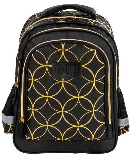 A Future by BackUp iskolatáska, hátizsák - Gold (PL15BDF39)  a kisiskolás korosztály számára ajánlott. A hátizsákban a könyvek, füzetek és a tolltartó 3 különböző méretű zsebbe pakolható. Kétoldalt egy-egy kis hálós zseb ben tárolható az innivalós kulacs. Hátsó része szivacsos,   ergonomikus  kialakí tású, mely kíméli a kisiskolások gerincét és segíti a helyes testtartást. Állítható vállpántja szintén párnázott, minden oldalán fényvisszaverő csíkokkal van ellátva a gyermekek biztonságának érdekében. Válassz hozzá illő  tolltartót ,   tornazsákot  az egyedi iskolaszetted kialakításához!