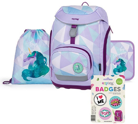 Iskolatáska szett OXY SHERPY 4 részes Unicorn tolltartóval, tornazsákkal és cserélhető matricával