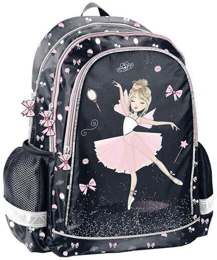 Balerina ergonomikus iskolatáska, hátizsák - 2 rekeszes - fekete (PP24DN-081)  a kisebb korosztály ruhatárának menő kiegészítője. A hátizsák 3 különböző méretű cipzáras rekesszel és 2 hálós oldalzsebbel rendelkezik. A gyermekek biztonságának érdekében több helyen fényvisszaverő csíkokkal van ellátva.  Az erősített , profilozott hátsó rész és a puha, állítható vállpántok a hátizsák viselését rendkívül kényelmessé teszik. A tetején lévő megerősített fogantyúval kézben is vihető.  A kiváló anyagnak köszönhetően az alsó része erős, strapabíró. A  Balerina iskolatáska, hátizsák  vagány és praktikus,  tökéletes társ a hétköznapokra vagy kirándulásokra!