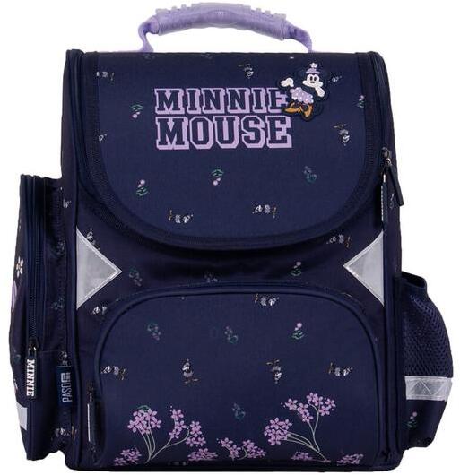 Disney - Minnie Mouse ergonomikus iskolatáska - lila-kék (DM24PP-525)  a közkedvelt, Disney kínálatában futó, animációs sorozat karaktere, Minnie egér látható. Az ergonomikus megnevezés azt takarja, hogy a tervezés során figyelembe veszik a kisiskolás korú gyermekek testi adottságait és olyan hátizsákot készítenek, mely kíméli a gerincet, segíti a helyes testtartást. A táska oldala merevített, hátsó része a gerinc két oldalán és a deréknál erősen párnázott, légáteresztő anyagú. Párnázott vállpántja állítható, hogy több évig is használható legyen. Ezt a célt szolgálja a kopásgátló  alsó rész. Kézben is kényelmesen hordozható, ezt a fülén lévő puha műanyag fogantyú biztosítja. Belsejében füzetelválasztó különíti el a könyveket, füzeteket. A tolltartó és az ellenőrző az elől, illetve oldalt lévő kisebb cipzáras zsebekben tárolható. Egyik oldalán egy hálós zseb van, mely a kulacs tárolására szolgál. A gyermekek biztonságának érdekében a táska minden oldalán fényvisszaverő elemek találhatóak.