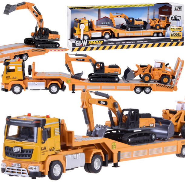 A vontatóval, kotrógéppel és buldózerrel felszerelt teherautó 1:40 méretarányban készült, és tökéletes ajándék az építőipari járművek rajongóinak. Az utánfutós nagy teherautó szilárd felépítésű és levehető pótkocsival rendelkezik. A kotrógép és a buldózer fémből és műanyagból készül, emellett mozgó alkatrészekkel is rendelkezik, mint például vödör, kar és lánctalp. A teherautó fel van szerelve a jármű indításának, tolatásának hangjával, kürttel és fényeffektusokkal, például villogó lámpákkal elöl és villogó jelzőfényekkel a teherautó tetején. Az építőipari gépeket nagy körültekintéssel és a részletekre való odafigyeléssel készítették. A járművek lehetővé teszik olyan készségek fejlesztését, mint a koncentráció, a kézügyesség, a gondolkodás sebessége, a mozgékonyság és a ravaszság.