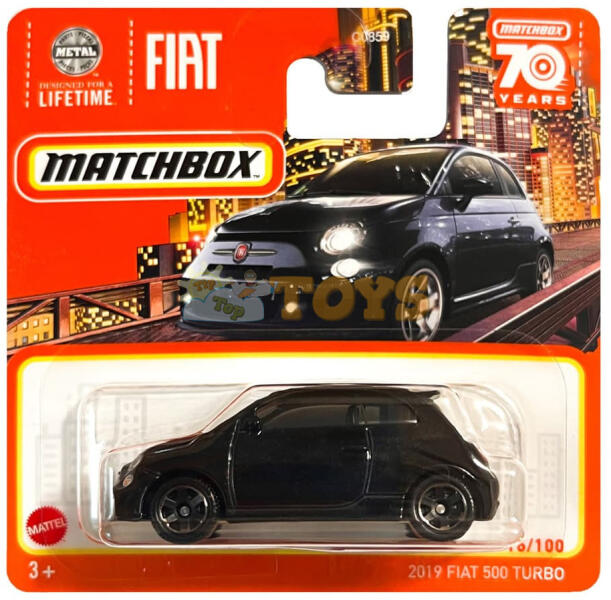 MATCHBOX Metal Car 2019 Fiat 500 Turbo HLD05 Mattel egy fémből és műanyagból készült játék, amely egy 2019-es Fiat 500 Turbo modellautót reprodukál, 1:64 színben fekete logóval. Fiat a motorháztetőn és a csomagtartón.