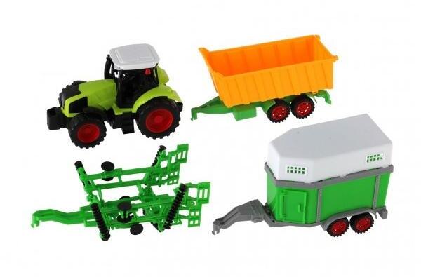 Ez a műanyag traktor pótkocsival remek játék kis gazdáknak. Teljes hossza 19 cm, három különböző pótkocsi változattal végtelen lehetőséget kínál a gyerekeknek a játékra és fantáziájuk fejlesztésére. A traktor lendkerekes, könnyű előre mozgást tesz lehetővé.