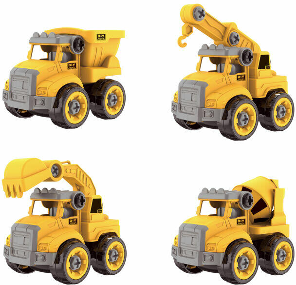 A készlet darut, keverőt, dömpereket, kotrógépet tartalmaz.