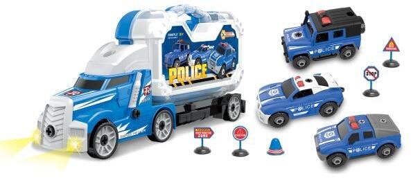 Rendőrautó teherautó 3 autóval csavarozós effektekkel szórakozást kínál a gyerekeknek az összeszerelés és a világító, hanghatású játék során. A teherautó és az autók részletes kidolgozással készültek, és könnyű kezelhetőséget biztosítanak.