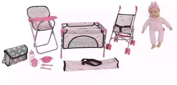 Minden babakiegészítő egy helyen!Ebben szettben minden megvan ami a babázáshoz kell: etetőszék, babakocsi, evőeszközök, pelusos táska, járóka, pléd... és persze ami nem hiányozhat - játékbaba. A kis anyukák kipróbálhatják milyen gondoskodni valakiről, a szerepjátéknak csak a képzelet szab határt. Az eszközök rózsaszín és szürke színűek, aranyos unikornis és pöttyös mintákkal. A játékbaba ruhája fele rózsaszín, fele pöttyös-rózsaszín, fején pedig egy sapka van, meg ne fázzon, ha beborulna az idő. A pelusos táskában elférnek az evőeszközök és a cumisüveg is. A babakocsi biztonsági övvel ellátott, így biztonságban utazhatnak együtt a babák az anyukáikkal. A játék fejleszti a fantáziát és a képzelőerőt. A „kis anyukák babájuk gondozásával a felnőttek világát utánozhatják szerepjáték által, így sokat tanulnak a felelősségvállalásról, a szeretetről, önállóságról és a gondoskodásról. A termék jellemzői:- Komplett készlet- Színes, mintás kiegészítők- Biztonsági öves babakocsi- Rózsaszín és szürke színvilág- Baba mérete: kb. 30 cmCsomagolás mérete: 42 x 54 x 11 cm