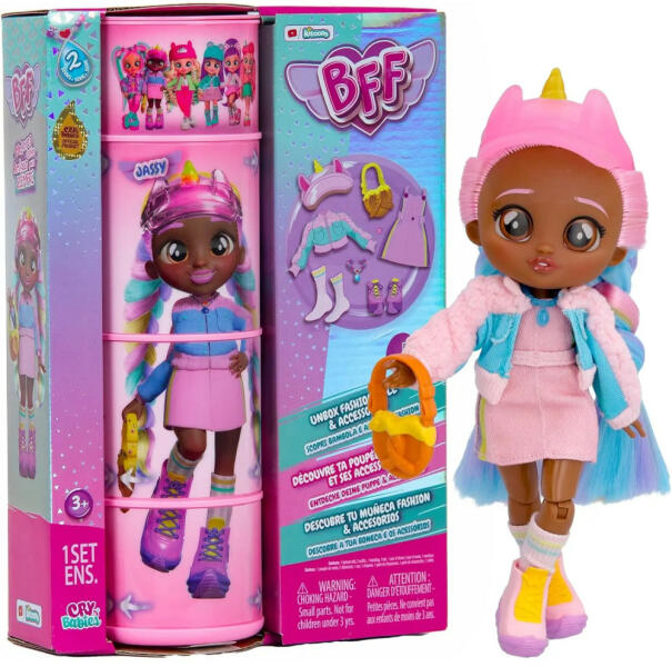 Lépjen be a divat és a barátság világába a Cry Babies BFF Jassy babával!A népszerű Cry Babies karakterek felnőttek, és most tinédzserként, legjobb barátnőkként (BFF) hódítják meg a világot! Ismerje meg Jassy-t, a csapat egyik legvagányabb tagját, aki imádja a divatot, a kalandokat és a barátaival töltött időt. Jassy készen áll, hogy gyermeke új legjobb barátnője legyen, és számtalan közös történetet éljenek át együtt. Jassy egy igazán egyedi jelenség hosszú, szivárványszínű, selymes hajával , amelyet gyermeke kedvére fésülhet és formázhat, így gyakorolva a fodrászos szerepjátékokat. A baba valósághű üvegszemei és trendi, sportos ruházata azonnal megragadja a fantáziát. A mozgatható végtagoknak köszönhetően Jassy-t rengeteg különböző pózba lehet beállítani, így a közös játék még élethűbbé és szórakoztatóbbá válik. A játékélmény már a kicsomagolásnál elkezdődik! A baba egy innovatív, henger alakú csomagolásban érkezik, amelynek részeit elforgatva fokozatosan fedezhetik fel magát Jassy-t és a benne rejlő 7 meglepetés kiegészítőt. A doboz nem csupán egy tároló, hanem a játék után egy praktikus gardróbszekrénnyé alakul, ahol Jassy a ruháit és kincseit tarthatja. A csomagban minden megtalálható egy divatos szetthez: egy menő dzseki, szoknya, egy pár zokni és cipő, egy egyedi, perec alakú táska, egy aranyos unikornis sapka és természetesen egy BFF nyaklánc, amely a barátságukat szimbolizálja. Ezek a kiegészítők végtelen lehetőséget kínálnak a stílusok kombinálására. Ez a játékbaba nem csupán szórakoztat, hanem fejleszti a gyermekek kreativitását, képzelőerejét és finommotoros készségeit is. Az öltöztetés és a szerepjátékok segítenek az érzelmi intelligencia és az önkifejezés fejlesztésében. Jassy a Cry Babies BFF kollekció egyik tagja. Gyűjtse össze a sorozat többi babáját is, hogy a baráti kör teljes legyen, és a lányok együtt indulhassanak a legújabb divatkalandokra! A babák ruhái és kiegészítői egymással is cserélgethetők, így a játéklehetőségek száma határtalan. A játék előnyei
