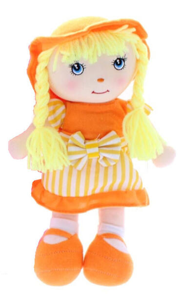 Puha rongybaba, kalapban és csíkos szoknyában. A rongybaba nagyon puha szövetből készült játékbaba, sárga fonal hajjal, nagy szemekkel és kedves mosollyal. A babát bárhova magaddal viheted, aludni is jó vele. A baba mérete: 32 cm.