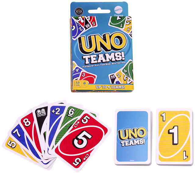 UNO Teams kártya Az UNO Teams megduplázza a klasszikus UNO izgalmait. A cél nem változott, a játékosok még mindig színre-színt, számra-számot vagy szimbólumot rakhatnak, de ahelyett, hogy mindenki a saját győzelméért küzdene, párokban játszanak a győzelemért. A speciális kártyák és szabályok segítik a csapattársakat az együttműködésben, és a győzelemhez mindkét játékosnak meg kell szabadulnia a kezében lévő összes kártyától - és persze az utolsó kártyához érve nem szabad elfelejteni azt kiáltani, hogy "UNO!" Játékosok száma: 2-4 csapat Játékidő: kb. 15-30 perc Korosztály: 7 éves kortól ajánljuk.