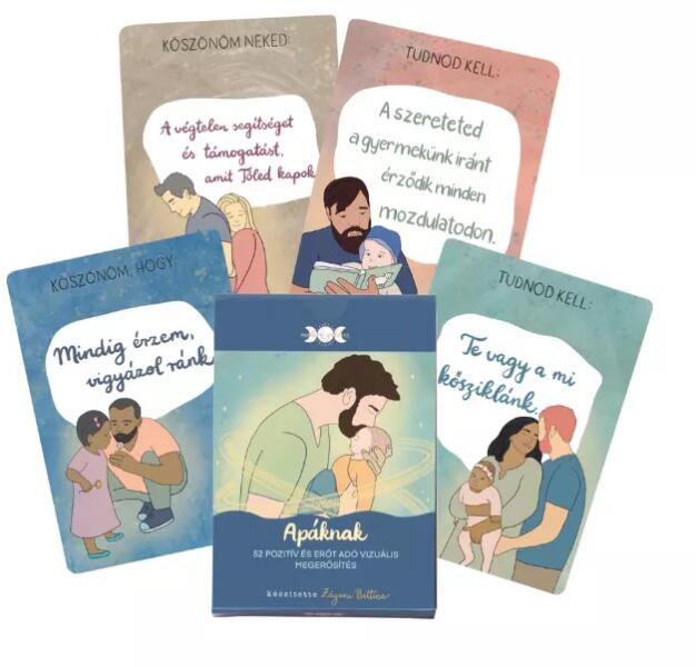 Apává válni épp olyan hatalmas kihívás, felelősség és világot felforgató tapasztalás, mint amilyen anyává. Szülés után mi nők erőnk, figyelmünk és szeretetünk legnagyobb részét a frissen született gyermeknek, gyermekeinknek adjuk. Ti férfiak pedig erőtökön felül tartotok meg minket ebben. Ti vagytok az a stabil csónak, ami oltalmat és biztonságot ad nekünk az élet gyakran viharos vizén.   Nagyon fontosak vagytok! Szeretnénk, ha tudnátok és éreznétek, hogy mi látjuk, szeretjük és becsüljük a férfit, a társat és az apát is Bennetek. Tudnotok kell, hogy Ti is számíthattok ránk! Igaz társat találni az életre nagy ajándék. Az Apáknak szóló kártyacsomag egy szerelmi vallomás, megerősítések és hála mondatok formájában tőlünk Nőktől, nektek Férfiaknak. A kártyacsomagban található két olyan kártya is, melyet szabadon kitölthettek saját vallomásaitokkal. + Valentin-napi, Apák-napi TIPP: Rejtsd el az otthonotok különböző pontjain a kártyacsomag számotokra legkedvesebb üzeneteit, és lepd meg vele a párod! Készítette: Zágoni Bettina