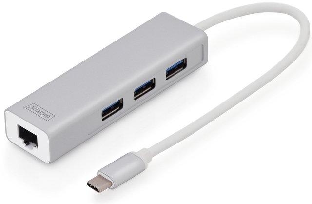 Digitus 3 Port USB 3.0 Type C Hub with Gigabit Ethernet 3xUSB A/F 1xUSB C/M 1xRJ45 LAN Supports Windows and Mac OS (DA-70255)